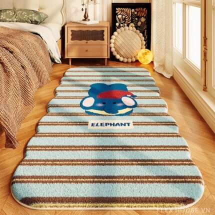 Điểm nhấn trung tâm là hình chú voi hoạt hình biểu trưng cho sự thân thiện, an toàn và trí tưởng tượng tuổi thơ. Thiết kế bo góc uốn lượn mềm mại không chỉ tăng tính thẩm mỹ mà còn hạn chế va chạm, phù hợp làm thảm chơi hoặc thảm trang trí phòng ngủ cho bé.