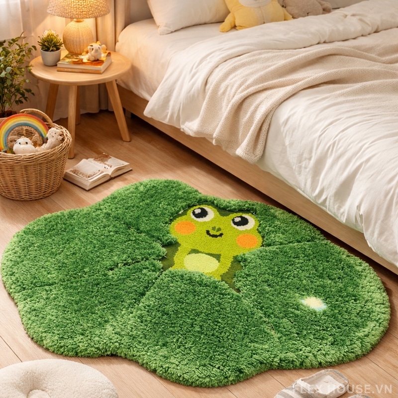 Lấy cảm hứng từ hình ảnh chú ếch xanh đáng yêu giữa lá sen xòe tròn, chiếc thảm lông JT9937 mang đến cảm giác thiên nhiên mát lành, vui tươi và gần gũi. Thiết kế hoạt hình sinh động giúp không gian trở nên thân thiện hơn, đặc biệt phù hợp với gia đình có trẻ nhỏ hoặc những ai yêu phong cách decor dễ thương, thư giãn.
