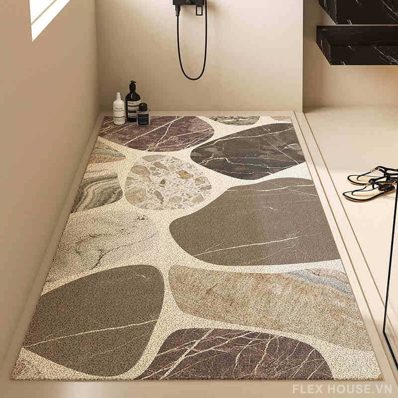 Lấy cảm hứng từ những phiến đá cuội tự nhiên nơi dòng suối yên bình, thảm lót sàn nhà tắm SH8456 mang đến cảm giác thư giãn, gần gũi thiên nhiên ngay trong không gian phòng tắm hiện đại. Họa tiết đá cuội được in kỹ thuật số sắc nét, phối màu trung tính tinh tế, dễ dàng hòa hợp với các phong cách decor từ tối giản, hiện đại đến spa – resort tại gia.