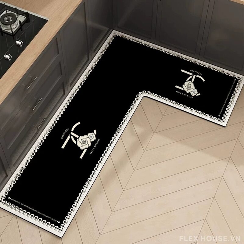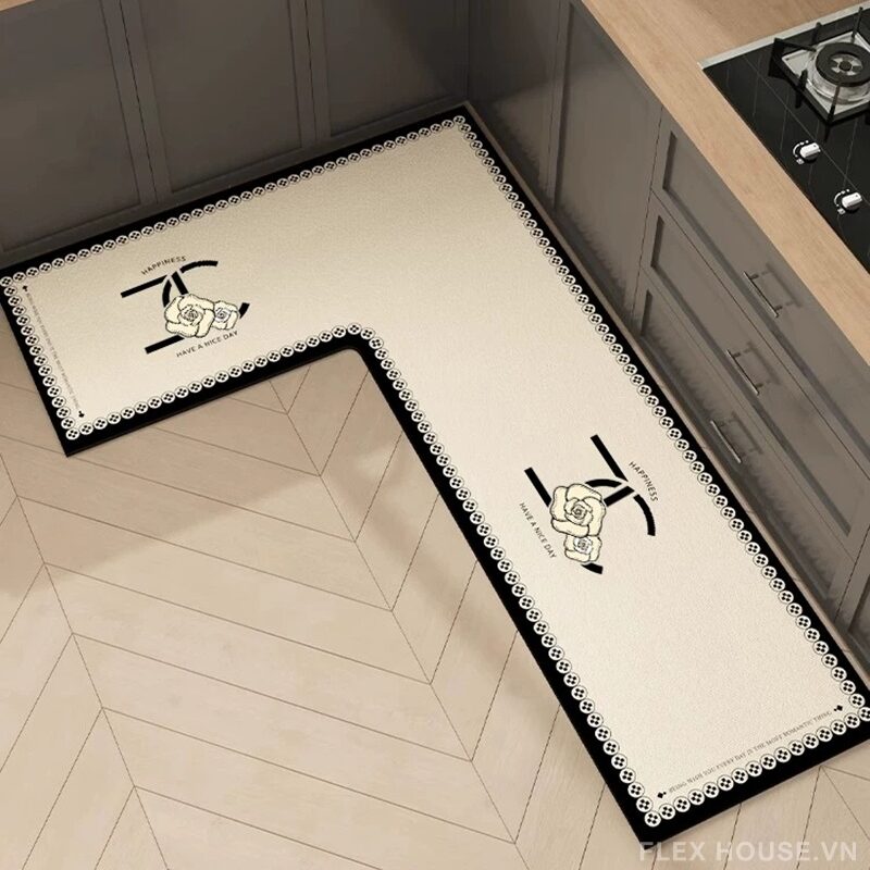 - Kiểu dáng: thảm bếp chữ L ôm góc tối ưu không gian