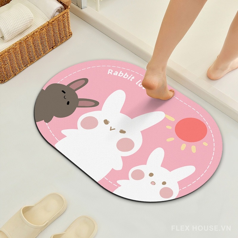 Bề mặt thảm được in hình chó Shiba, thỏ con, hay bộ ba thú chơi nhạc vui nhộn, giúp bạn thêm thư giãn và dễ chịu mỗi lần bước chân ra khỏi phòng tắm. Không chỉ đẹp mắt, thảm nhà tắm XF0616 còn được làm từ chất liệu tảo cát siêu thấm hút, giúp sàn nhà luôn khô ráo, sạch sẽ và an toàn.