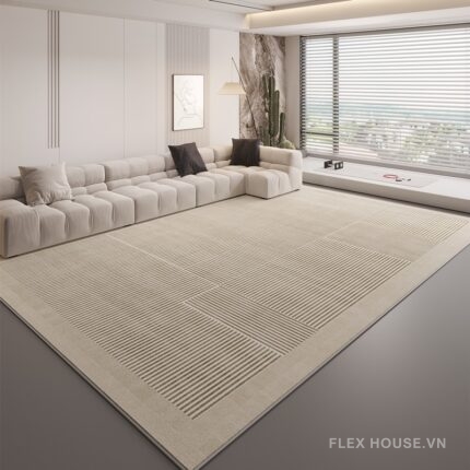 Mẫu thảm phòng khách hiện đại XF3099 mang phong cách tối giản, nổi bật với bố cục hình học rõ ràng và nhịp điệu thị giác mạch lạc. Tông màu kem trung tính kết hợp họa tiết kẻ mảnh giúp không gian trở nên sáng, thoáng và gọn gàng hơn, đặc biệt phù hợp với các phòng khách căn hộ cao cấp, không gian mở hoặc nội thất Japandi – Bắc Âu.
