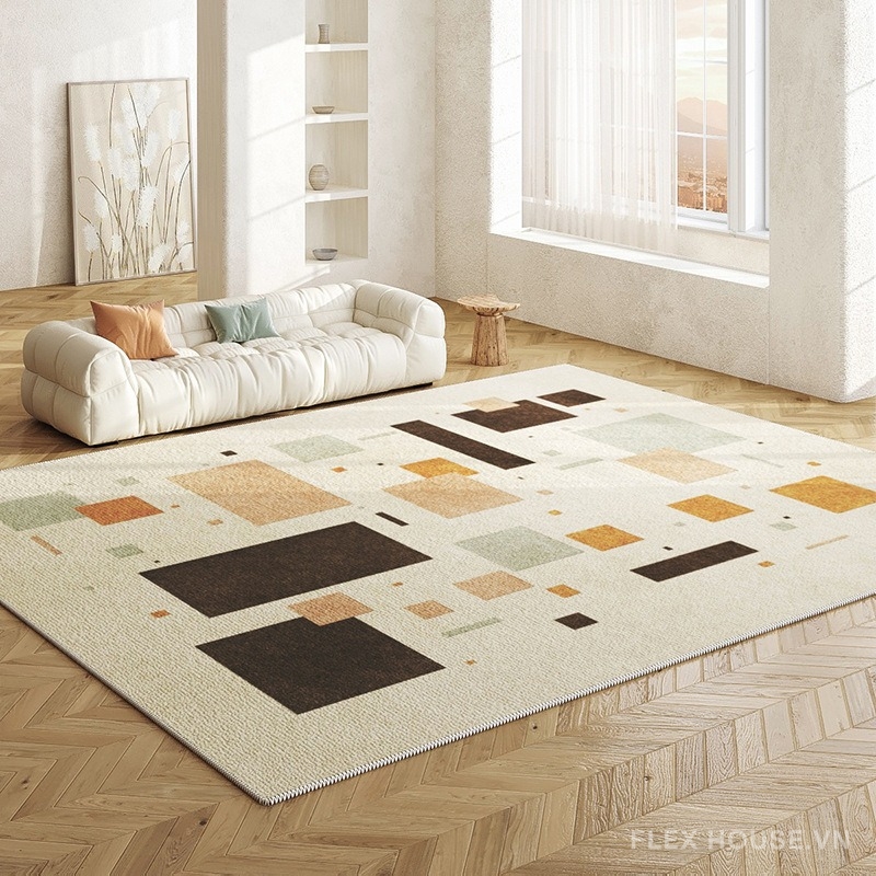 Mang hơi thở của thảm phong cách Bắc Âu hiện đại pha chút lãng mạn Pháp, XF8449 là lựa chọn hoàn hảo để làm bừng sáng không gian sống của bạn. Tông màu kem ngà nhẹ nhàng hòa cùng những khối họa tiết hình học – vuông, tam giác, thanh ngang – được phối khéo léo giữa các sắc vàng ấm, nâu gỗ, xanh olive và cam đất, gợi cảm giác ấm cúng mà vẫn tinh tế, hiện đại.
