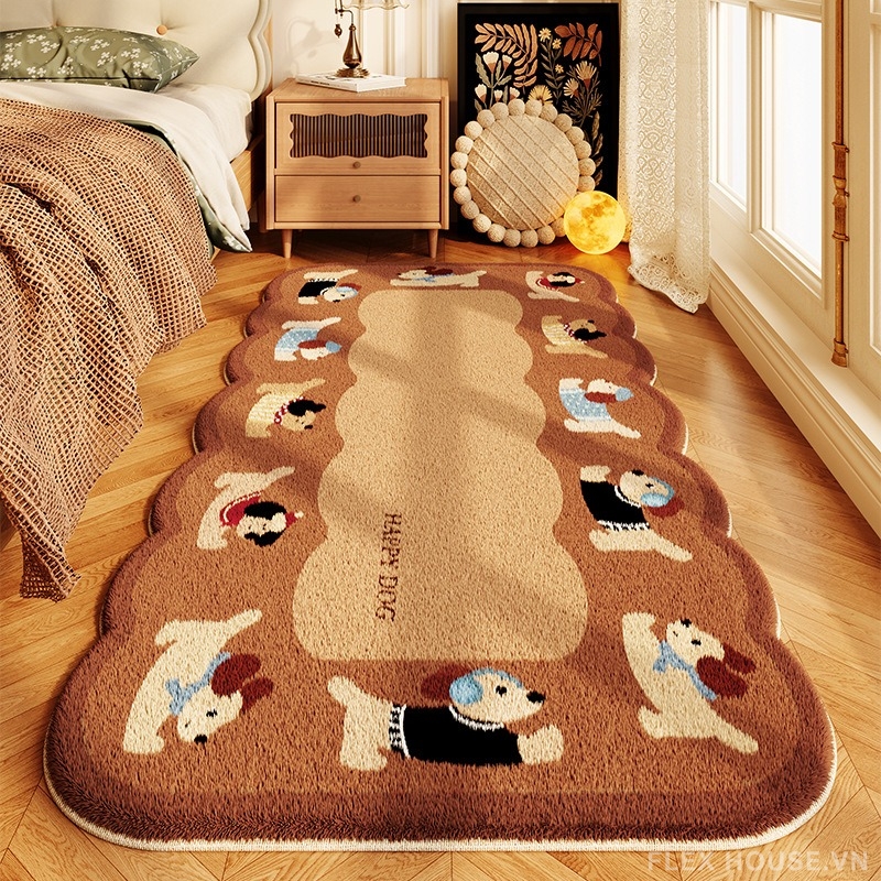 Thảm polyester YY6913 mang phong cách Nursery Art kết hợp Cartoon hiện đại, nổi bật với hình ảnh những chú cún nhỏ được minh họa sinh động xếp vòng quanh thảm, tạo cảm giác như một câu chuyện tuổi thơ đang diễn ra trên sàn nhà. Bố cục đối xứng, viền bo uốn lượn mềm mại giúp tổng thể vừa đáng yêu, vừa an toàn cho trẻ nhỏ.