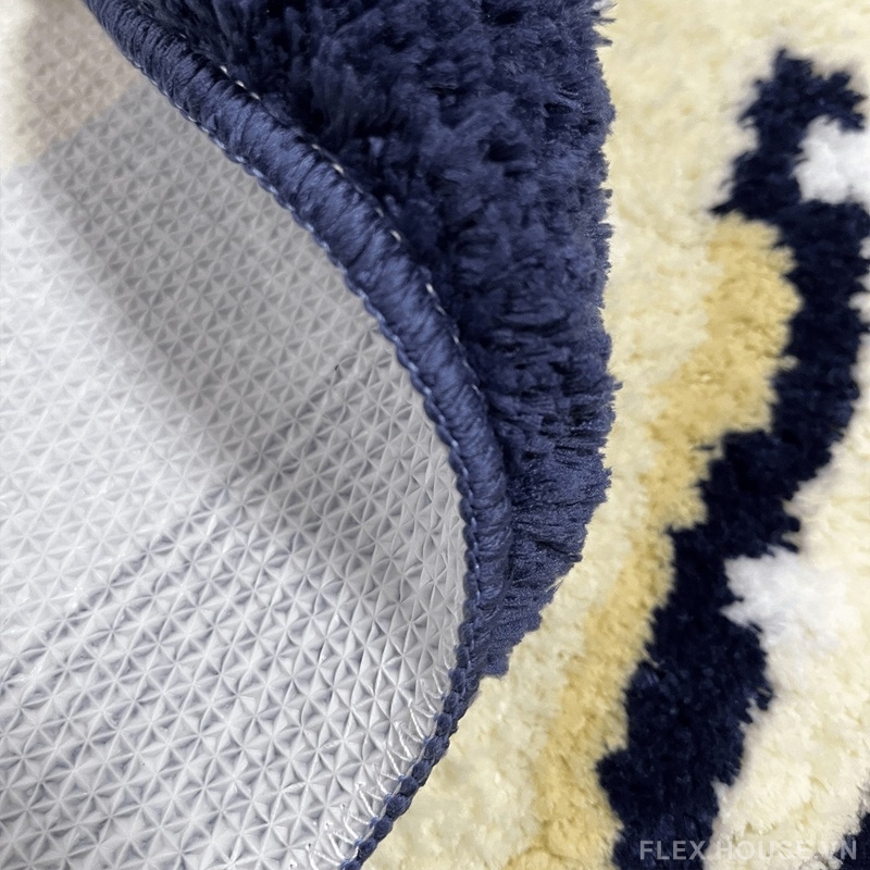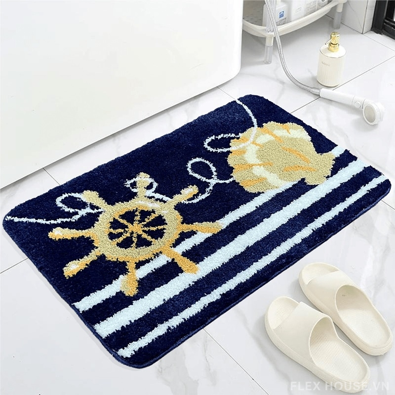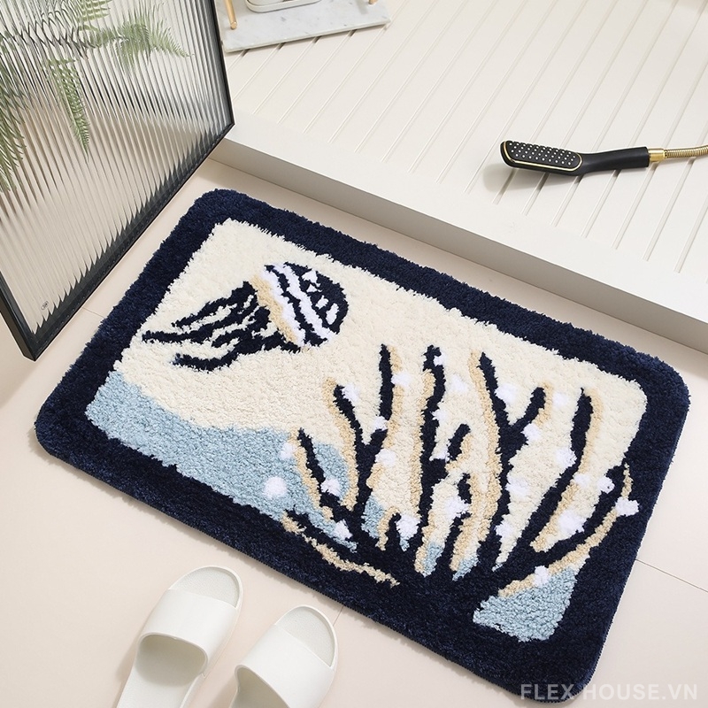 Lấy cảm hứng từ thế giới đại dương xanh thẳm, thảm polyester mang họa tiết san hô, sứa biển và sóng nước cách điệu đầy nghệ thuật. Tông xanh navy – trắng kem – xanh biển nhạt tạo hiệu ứng thị giác dịu mắt, giúp không gian phòng tắm trở nên sinh động nhưng vẫn giữ được nét hiện đại, tinh tế.