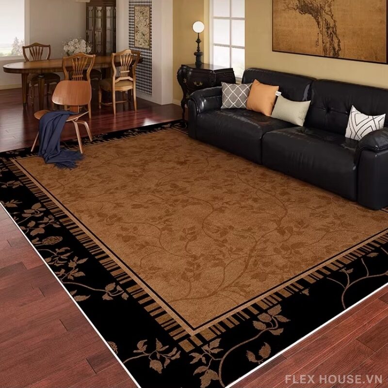 Thảm sofa phòng khách HY3970 mang đến giải pháp hoàn hảo với tông nâu cổ điển (antique brown) kết hợp họa tiết hoa chìm tinh tế. Thiết kế này không quá phô trương nhưng đủ để tạo chiều sâu, giúp không gian trở nên ấm áp, sang trọng và có gu hơn rõ rệt.