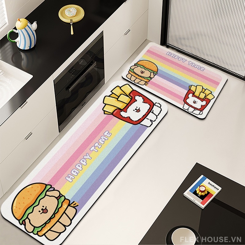 Thảm tảo cát JX5547 gây ấn tượng ngay từ ánh nhìn đầu tiên với họa tiết chó con đáng yêu hóa thân thành hamburger, khoai tây chiên, bánh quy… trên nền sọc pastel mềm mại. Phong cách minh họa kawaii – cartoon food art mang lại cảm giác vui vẻ, ấm áp, giúp không gian bếp trở nên sinh động và “có hồn” hơn mỗi ngày.