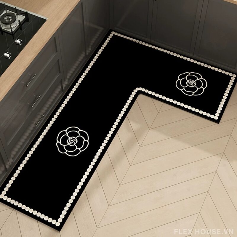 Thảm bếp HY9866 gây ấn tượng mạnh với thiết kế nền đen tối giản kết hợp họa tiết hoa trà trắng tinh tế, mang đậm phong cách Modern Luxury. Viền chấm tròn đều đặn tạo hiệu ứng trang trí thanh lịch, giúp không gian bếp trở nên gọn gàng, sang trọng và có chiều sâu thị giác.