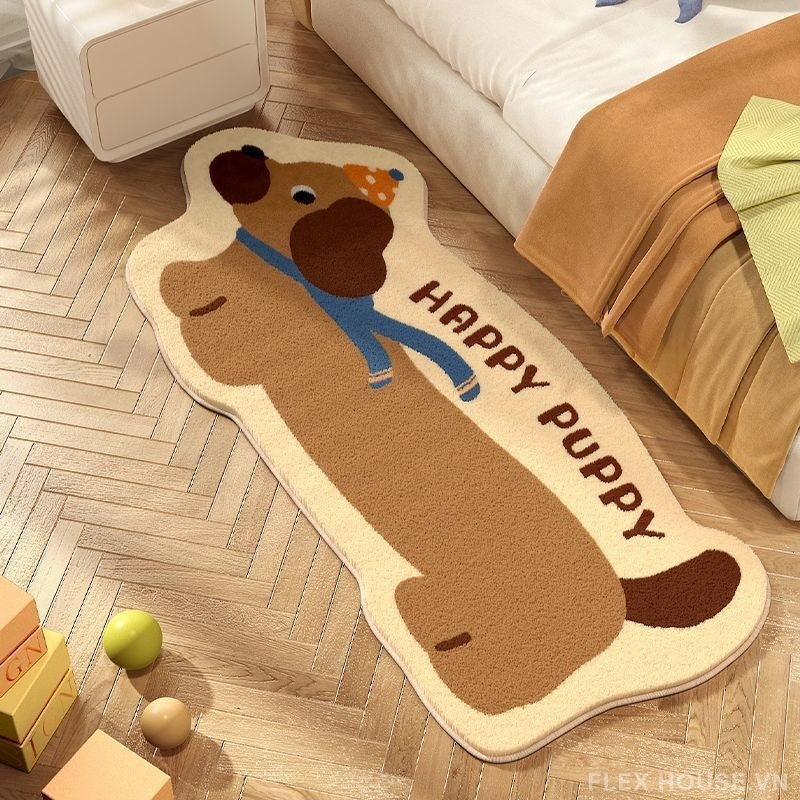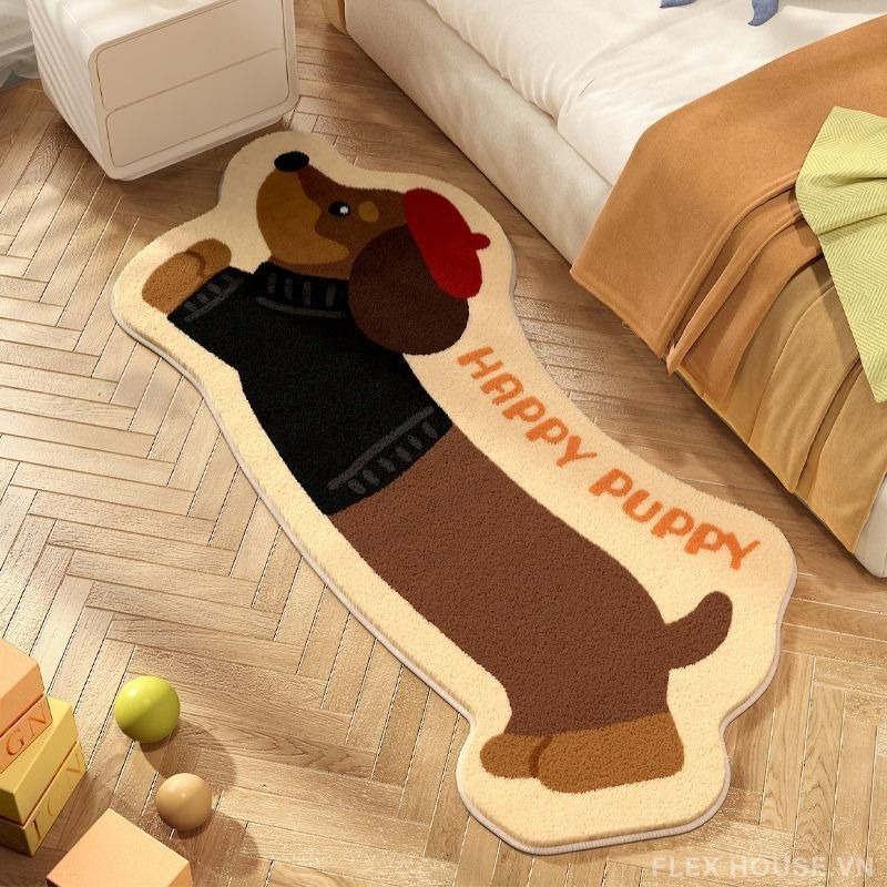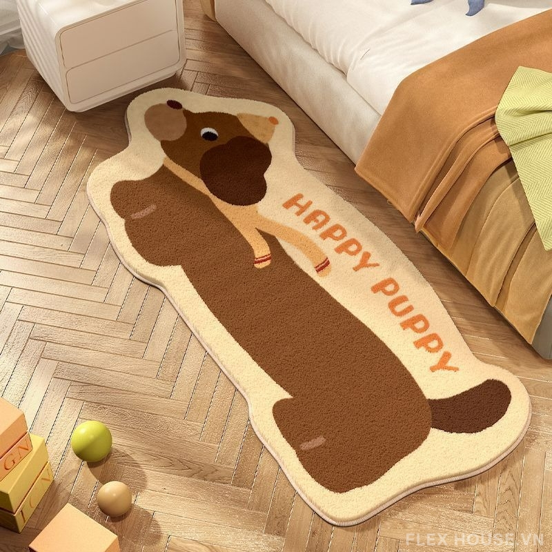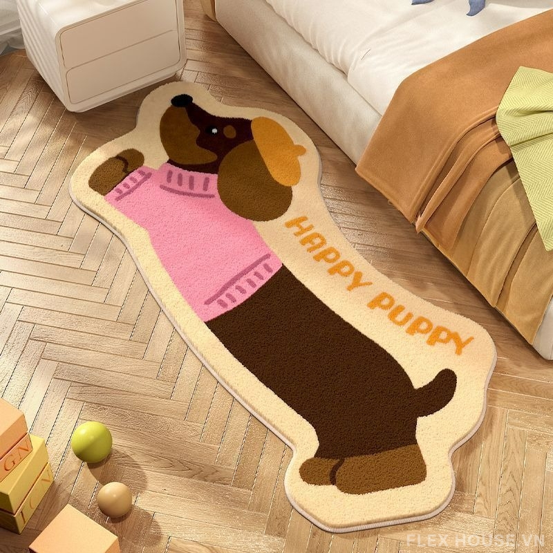 Lấy cảm hứng từ chú chó lạp xưởng Dachshund nổi tiếng với thân hình dài ngộ nghĩnh, thảm trải sàn SH8098 mang đến một thiết kế cực kỳ đáng yêu và sinh động cho không gian phòng trẻ. Dáng thảm được tạo hình theo chú chó nằm dài vui nhộn, kết hợp cùng dòng chữ “Happy Puppy” đầy năng lượng, giúp căn phòng trở nên ấm áp, thân thiện và tràn ngập cảm giác vui tươi. Đây là kiểu thảm rất phù hợp với phòng ngủ trẻ em, góc chơi của bé, phòng học hoặc các studio decor phong cách cartoon – INS dễ thương.