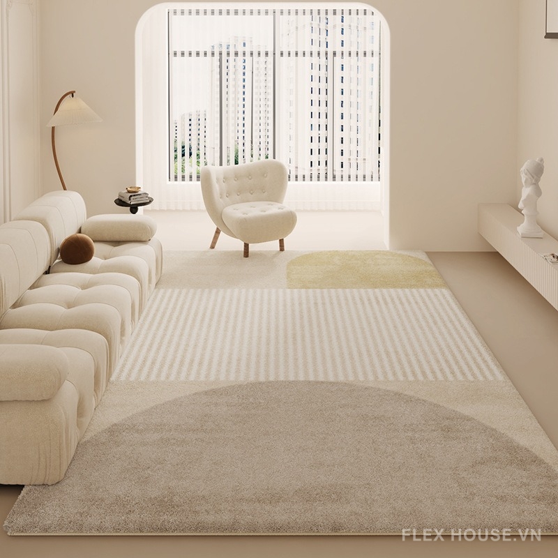 Thảm trải sàn phòng khách cao cấp XF7408 có khả năng “làm mềm” không gian nhờ những đường kẻ song song tạo chiều sâu thị giác, trong khi các khối hình bán nguyệt và oval mang lại cảm giác ấm cúng, cân bằng, rất phù hợp với phong cách Scandinavian, Japandi, Minimalist và các căn hộ hiện đại đề cao sự thư thái.