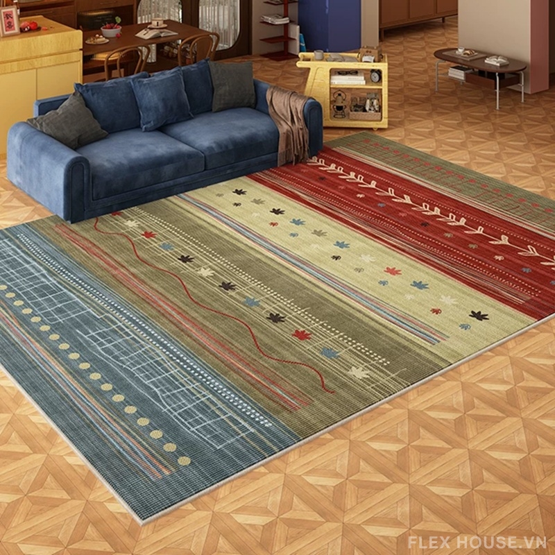 ấy cảm hứng từ vẻ đẹp dịu dàng của mùa thu, thảm trải sàn phòng khách cao cấp HY3362 mang đến một “bản hòa ca sắc màu” ấm áp với những dải màu đan xen như giai điệu Autumn Melody đầy cảm xúc. Các gam màu trầm như xanh rêu, đỏ gạch, be, xám… được phối hợp tinh tế cùng họa tiết lá nhỏ điểm xuyết, tạo nên tổng thể vừa cổ điển vừa hiện đại – phù hợp với nhiều phong cách nội thất từ Vintage đến Contemporary.