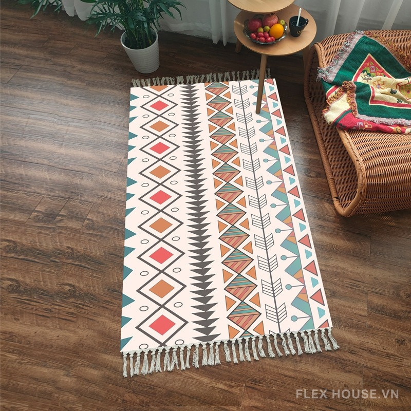 Điểm nhấn độc đáo của thảm trang trí XF8396 nằm ở bảng màu rực rỡ: phiên bản Red–Teal Tribal trẻ trung và phiên bản Yellow–Blue Tribal ấm áp, nổi bật. Nhờ sự kết hợp màu sắc thông minh, XF8396 dễ dàng trở thành điểm sáng trong phòng khách, cạnh sofa, studio decor hoặc homestay phong cách Boho – Aztec.