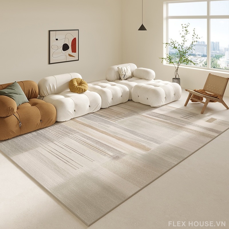 Đây chính là lý do nhiều người yêu thích phong cách Nordic Minimal luôn tìm kiếm những mẫu thảm có bảng màu tinh tế, nhẹ nhàng nhưng vẫn mang tính nghệ thuật. Một thiết kế vừa đủ nổi bật để tạo chiều sâu cho không gian, vừa đủ giản lược để giữ được cảm giác thuần khiết, thoáng đãng và thư giãn cho phòng khách.