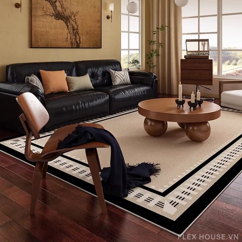 Thảm trải sofa HY3968 gây ấn tượng với thiết kế Geometric Border – viền hình học hiện đại, kết hợp hoàn hảo giữa nét tối giản và tinh thần decor cao cấp. Phần trung tâm màu kem trang nhã tạo cảm giác rộng rãi, thoáng đãng, trong khi viền đen phối họa tiết hình học mang đến điểm nhấn sắc nét, giúp không gian trở nên gọn gàng và có bố cục rõ ràng hơn.