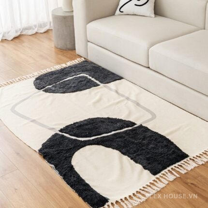 Thảm trải sofa XF2528 gây ấn tượng mạnh với họa tiết trừu tượng đen – trắng mang tinh thần Modern Art & Minimalism. Các mảng khối cong được sắp xếp tự do trên nền sáng, gợi liên tưởng đến ngôn ngữ hội họa hình khối đương đại, nơi đường nét không bị ràng buộc bởi quy tắc đối xứng mà nhấn mạnh cảm xúc và cá tính không gian.