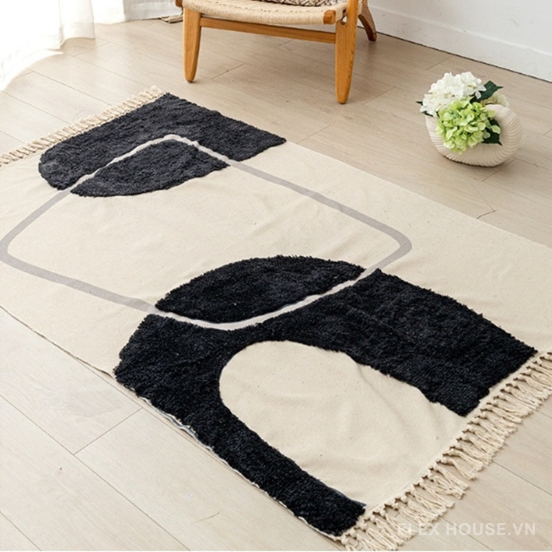 Điểm đặc biệt của mẫu thảm trải sàn nằm ở kỹ thuật chần bông nổi ba chiều, tạo sự tương phản rõ rệt giữa nền phẳng cotton–linen và phần họa tiết sợi nổi mềm dày. Tổng thể vừa mạnh mẽ, hiện đại, vừa giữ được sự ấm áp thủ công – rất phù hợp với không gian Japandi, Scandinavian, Minimal, Contemporary hoặc căn hộ phong cách gallery nghệ thuật.