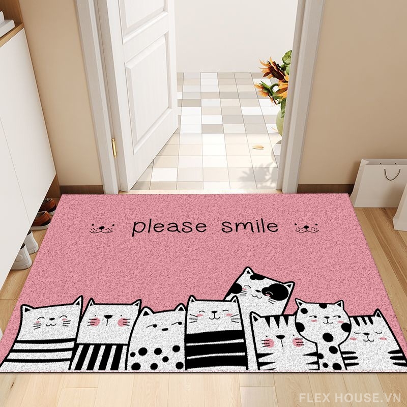 Thảm cửa ra vào YY105 mang đến cảm giác vui tươi ngay từ ngưỡng cửa với họa tiết những chú mèo hoạt hình xếp hàng đáng yêu cùng dòng chữ “please smile” đầy năng lượng tích cực. Phong cách cartoon hiện đại pha graphic tối giản, tông hồng pastel dịu nhẹ giúp không gian trở nên ấm áp, thân thiện và cực kỳ “ăn ảnh”.