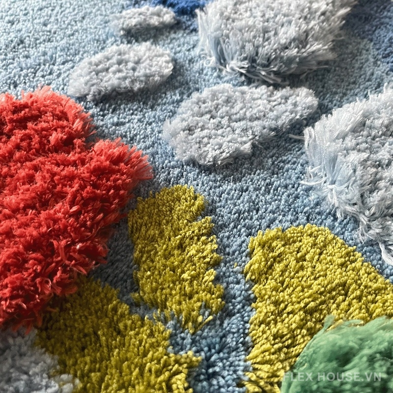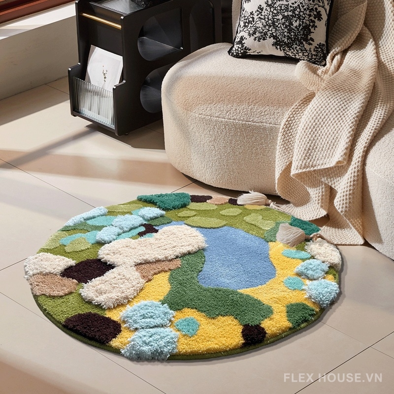 Lấy cảm hứng từ địa hình tự nhiên – rừng, hồ nước, thảm thực vật, thảm trang trí JT4132 được thiết kế theo phong cách trừu tượng hữu cơ với các mảng màu nổi khối, độ cao thấp khác nhau như một bức tranh cảnh quan thu nhỏ. Tổng thể thảm mang hơi hướng Decor Art & Scandinavian đương đại, tạo điểm nhấn thị giác mạnh nhưng vẫn hài hòa, thư giãn cho không gian sống.