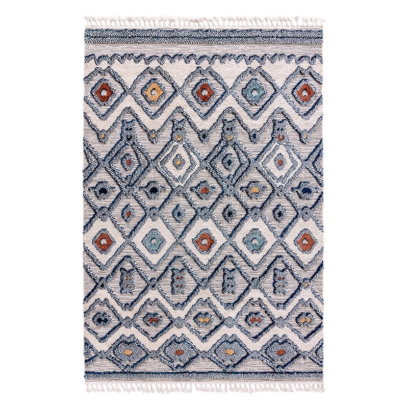 Thảm trang trí XF5389 gây ấn tượng mạnh với hệ họa tiết kim cương liên hoàn, lấy cảm hứng từ phong cách Bohemian pha Scandinavian. Tông màu chủ đạo xanh navy – teal – cam gạch được phối trên nền kem trung tính, tạo nên một bố cục giàu chiều sâu nhưng vẫn giữ sự hài hòa, trang nhã.