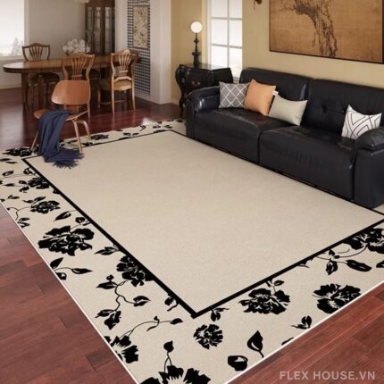 Lấy cảm hứng từ phong cách Đông Dương đầy nghệ thuật, thảm trang trí phòng khách HY3964 nổi bật với họa tiết hoa lá đen tương phản trên nền kem trang nhã – tựa như những nét mực vẽ tay mềm mại, thanh thoát. Thiết kế viền hoa bao quanh tạo hiệu ứng khung tranh độc đáo, giúp không gian phòng khách trở nên tinh tế, có chiều sâu và đậm chất decor cao cấp.