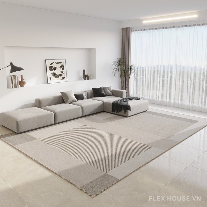 Điểm nổi bật của thảm trải sàn XF3111 nằm ở cách chia mảng có nhịp điệu: khối trung tâm tạo điểm tụ thị giác, trong khi các dải kẻ mảnh xung quanh mang lại sự chuyển tiếp nhẹ nhàng, không cứng nhắc. Bề mặt thảm được dệt từ sợi polyester cao cấp, cho cảm giác mịn nhẹ, dễ chịu khi sinh hoạt hằng ngày; kết hợp đế nhung pha lê chấm bi chống trượt, giúp thảm bám sàn ổn định, an toàn nhưng vẫn giữ trọn tinh thần Japandi – Contemporary Zen – Home Trend.