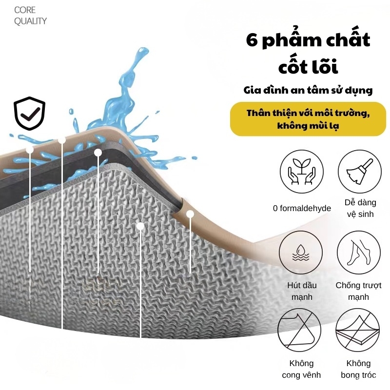 Không chỉ đẹp, thảm nhà bếp chống trượt JT9705 còn được hoàn thiện từ vải công nghệ sợi ngắn cao cấp, thân thiện với da, không formaldehyde – không mùi lạ, an toàn cho gia đình có trẻ nhỏ. Kết cấu nhiều lớp giúp thảm vừa êm chân khi đứng nấu ăn lâu, vừa giữ form ổn định, không cong vênh trong quá trình sử dụng.