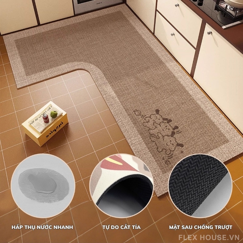 Không chỉ đẹp về thiết kế, thảm còn được sản xuất từ vải công nghệ dệt máy hiện đại, giúp bề mặt bền chắc, dễ vệ sinh và phù hợp với môi trường bếp thường xuyên tiếp xúc với nước và dầu mỡ. Thiết kế thảm góc chữ L chuyên dụng cho bếp giúp che phủ khu vực đứng nấu và rửa chén, đồng thời kết hợp lớp đế cao su chống trượt giúp thảm bám chắc mặt sàn, mang lại sự an toàn và tiện nghi trong quá trình sử dụng.