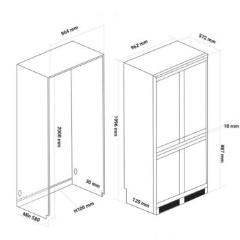 - Kích thước âm tủ (Product Dimensions): 964R x Min580S x 2000C mm