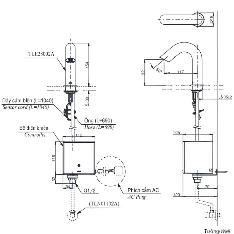 - Cảm biến được đặt bên dưới đầu vòi để phát hiện chính xác hơn