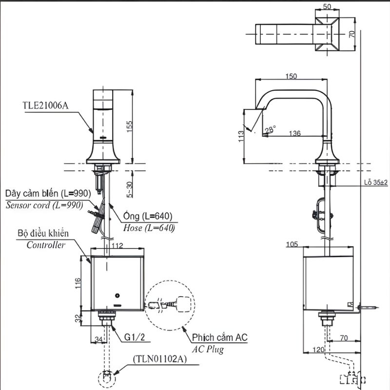 TLE21006A là vòi lavabo cảm ứng tự động gắn bàn với thiết kế vuông vắn, mạnh mẽ nhưng vẫn tinh tế. Thân vòi làm từ đồng không gỉ và phủ lớp Niken-Crom bóng sáng, vừa bền bỉ vừa nổi bật trong không gian phòng tắm. Cảm biến đặt bên dưới đầu vòi giúp dòng nước bật/tắt tự động nhanh chóng, êm ái, mạnh vừa đủ để rửa sạch mà không cần chạm, hạn chế tiếp xúc và đảm bảo vệ sinh.