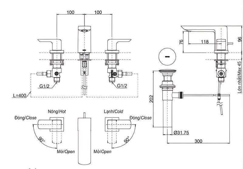 - Chất liệu: Đồng thau mạ niken/Chrome cao cấp, hạn chế bị ăn mòn trong môi trường ẩm ướt