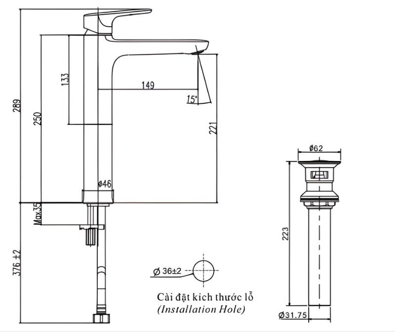 - Áp lực nước: 0.05 MPa ~ 0.75 MPa