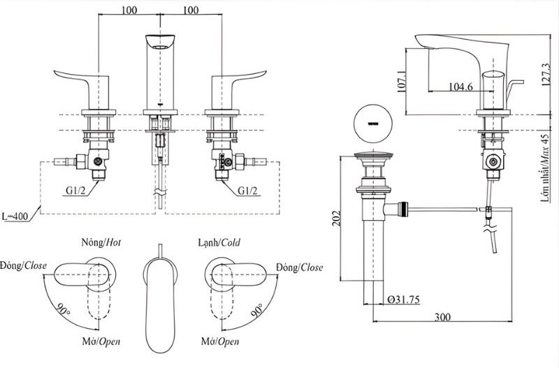- Áp lực nước: 0.05 ~ 1.0 MPa