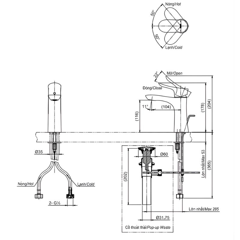 - Áp lực nước: 0.05 ~ 1.0 MPa