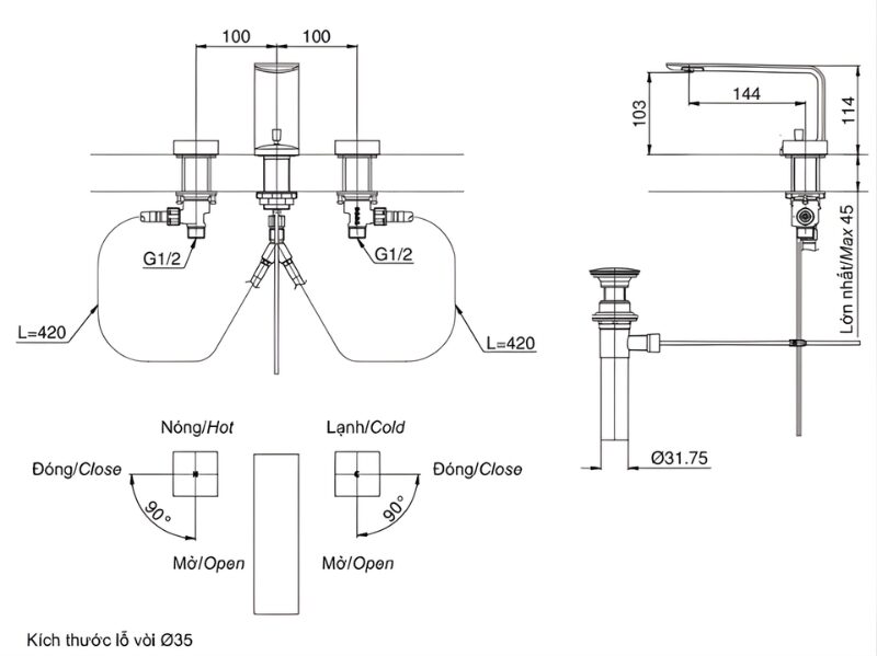 Lưu ý: Vòi chưa bao gồm bộ xả và ống thải chữ P